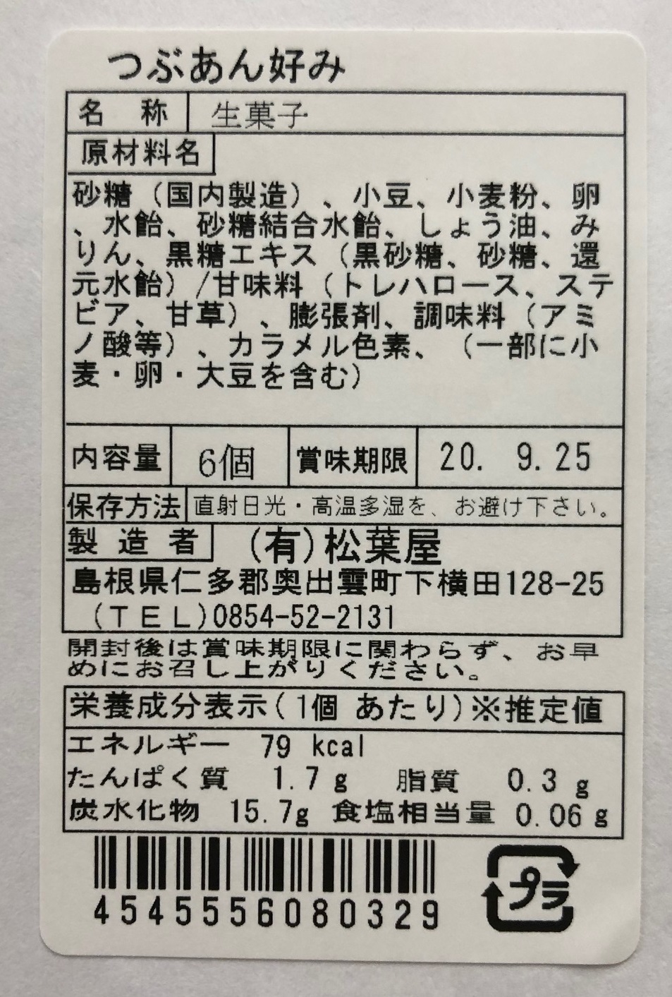 | 原材料 | 砂糖(国内製造)、小豆、小麦粉、卵、水飴、砂糖結合水飴、しょう油、みりん、黒糖エキス(黒砂糖、砂糖、還元水飴)/甘味料(トレハロース、ステビア、甘草)、膨張剤、調味料(アミノ酸等)、カラメル色素、(一部に小麦・卵・大豆を含む) |