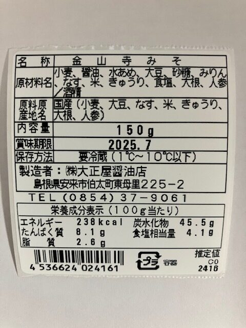 | 原料の産地 | 国産(小麦、大豆、なす、米、胡瓜、大根、人参) |