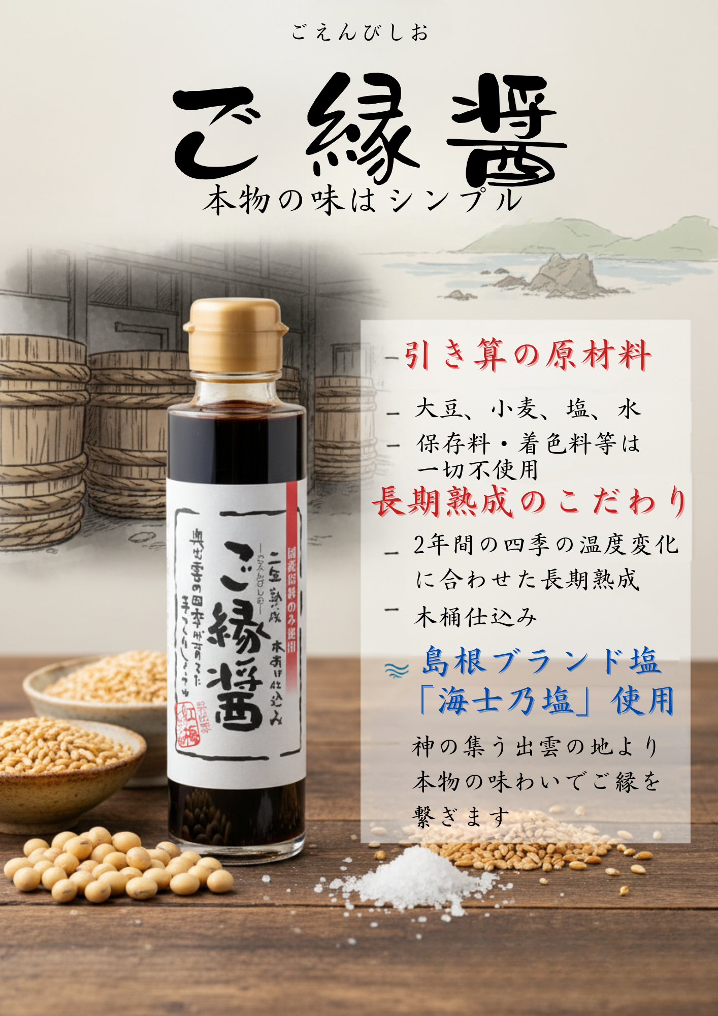- ”ご縁醤(ごえんびしお)” 保存料・着色料は一切不使用