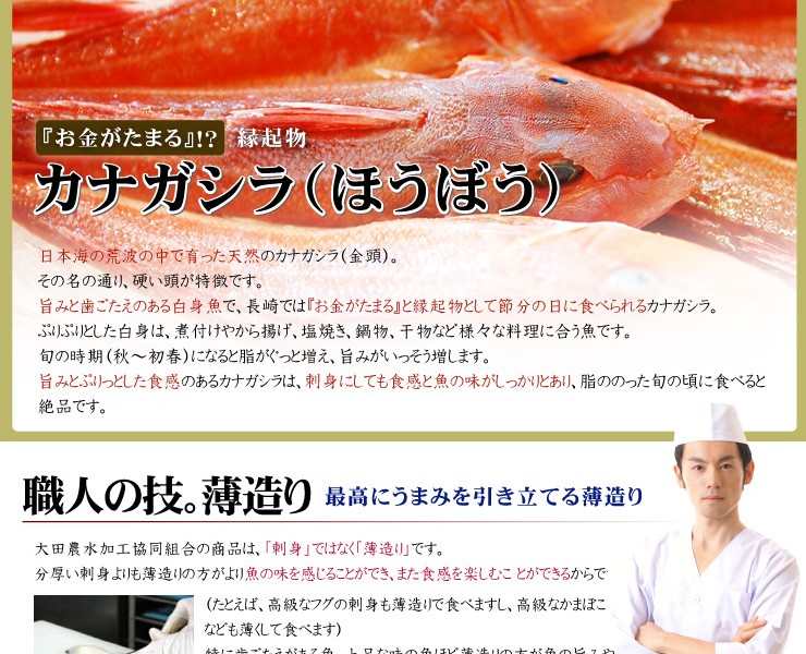 | 商品名(読み仮名) | 天然カナガシラ薄造り (てんねんかながしらうすづくり) |