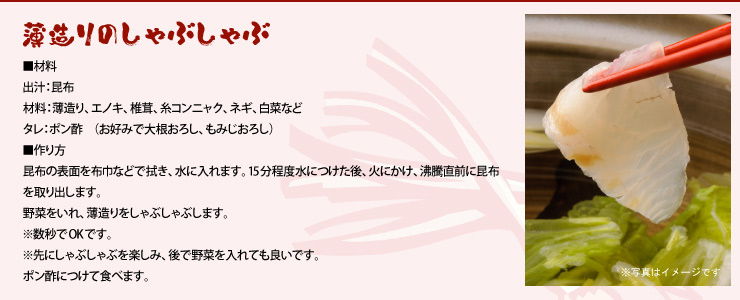 おすすめメニュー そのまま、薬味を挟みポン酢で薄造りとして。鍋に野菜を入れ、魚をさっとくぐらせしゃぶしゃぶに。〆にご飯と卵で雑炊に。または、暖かいご飯の上に乗せ、熱いだし汁を掛け、お茶漬けに。生野菜の上にそのまま乗せ、カルパッチョに。使い方は自由自在。(お皿の色は写真と異なる事があります。)
