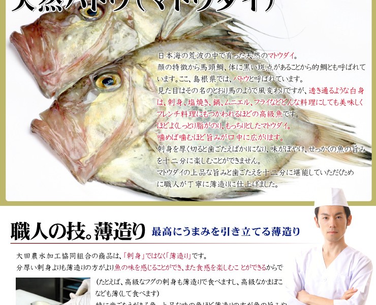 日本海産の天然バトウを1つ1つ丁寧に、職人技で薄造りにしています。さっとしゃぶしゃぶして野菜、薬味と一緒にポン酢でお召し上がり下さい。その他にカルパッチョや生茶漬けや雑炊など、使い方は自由自在。