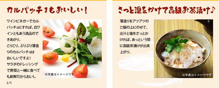 | 利用シーン・食シーン | 薄造りとして、しゃぶしゃぶとして、カルパッチョとして、雑炊として、 |