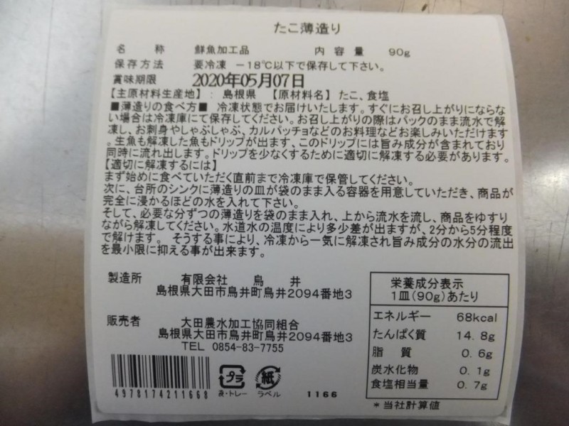 | 商品名(読み仮名) | 天然たこ薄造り (てんねんたこうすづくり) |