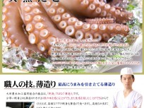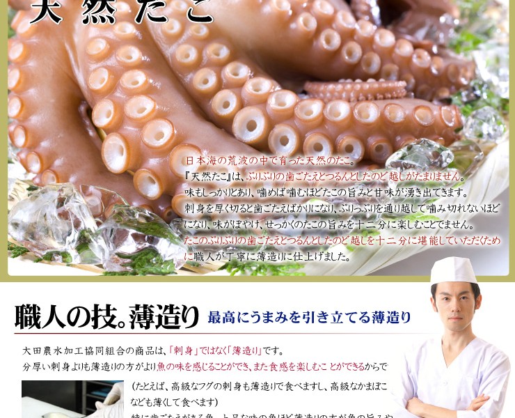 日本海産の天然たこを1つ1つ丁寧に、職人技で薄造りにしています。さっとしゃぶしゃぶして野菜、薬味と一緒にポン酢でお召し上がり下さい。その他にカルパッチョや生茶漬けや雑炊など、使い方は自由自在。