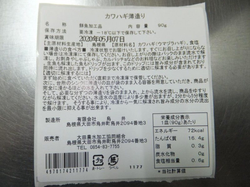 商品名(読み仮名) 天然カワハギ薄造り (てんねんかわはぎうすづくり)