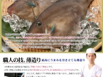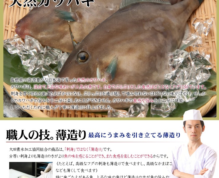 日本海産の天然カワハギを1つ1つ丁寧に、職人技で薄造りにしています。さっとしゃぶしゃぶして野菜、薬味と一緒にポン酢でお召し上がり下さい。その他にカルパッチョや生茶漬けや雑炊など、使い方は自由自在。