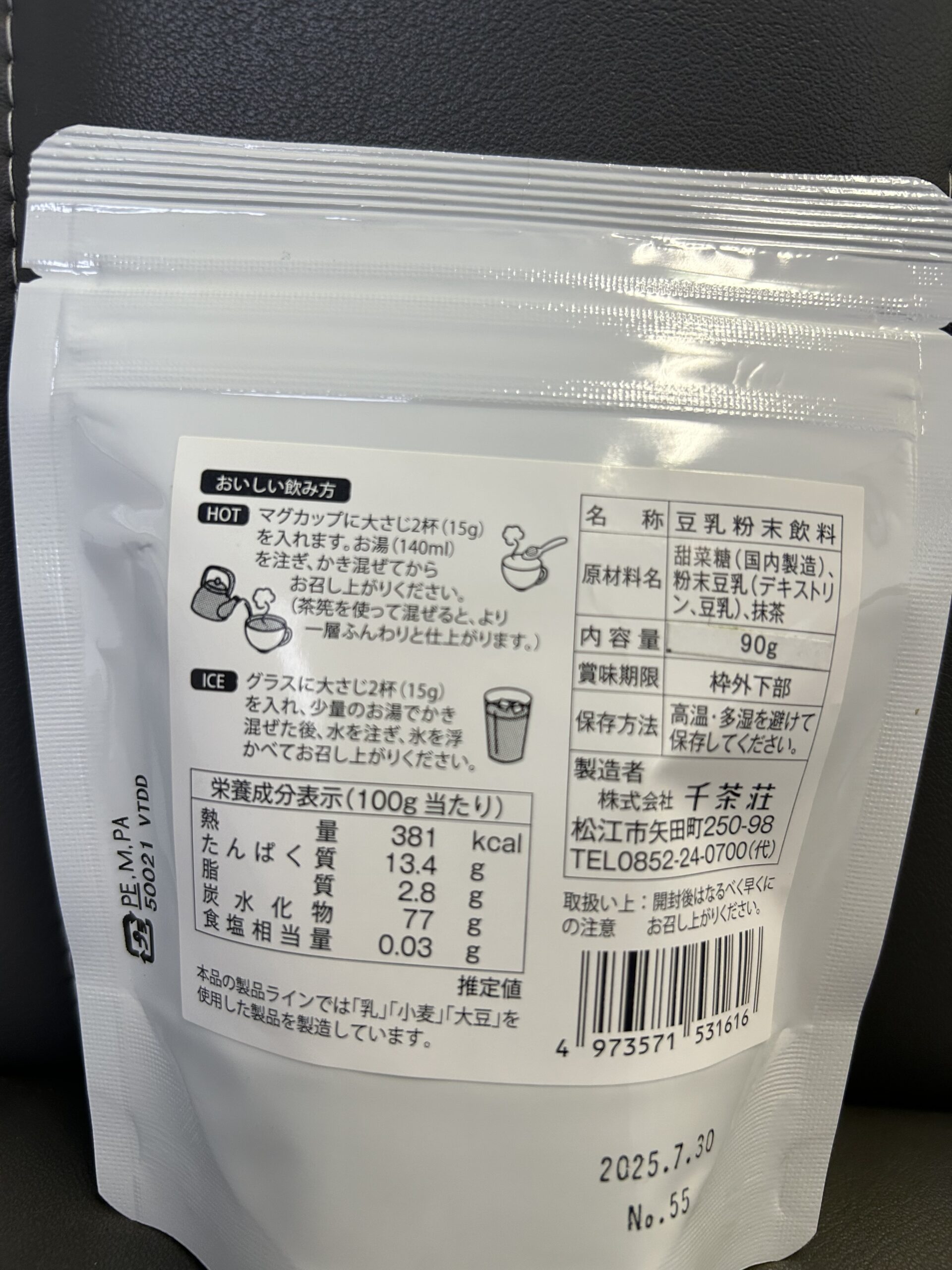 | 原材料 | 甜菜糖、豆乳パウダー、抹茶 |