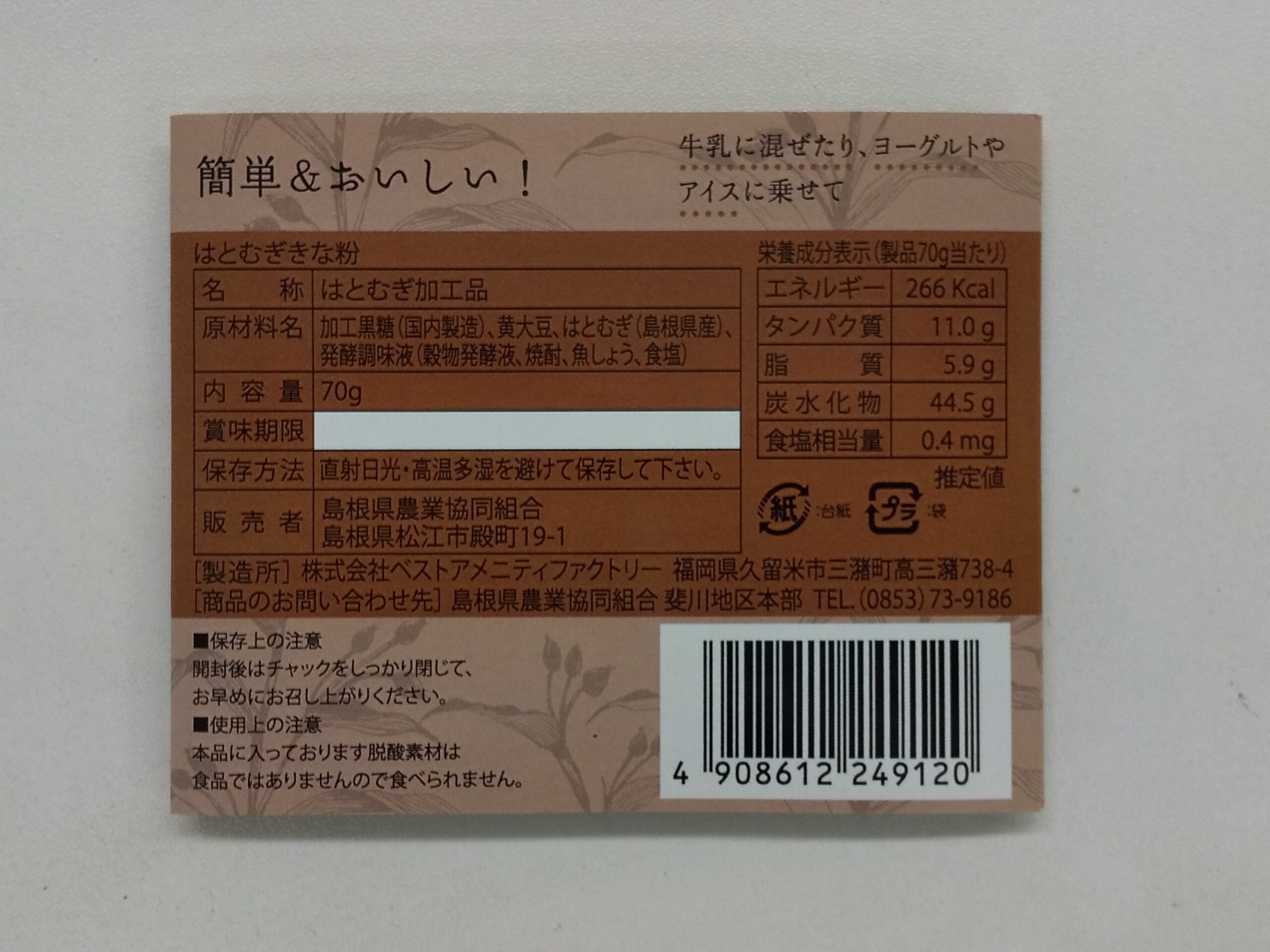 | 原料の産地 | 加工黒糖(国内製造)、黄大豆(国産)、はとむぎ(出雲市斐川町産) |