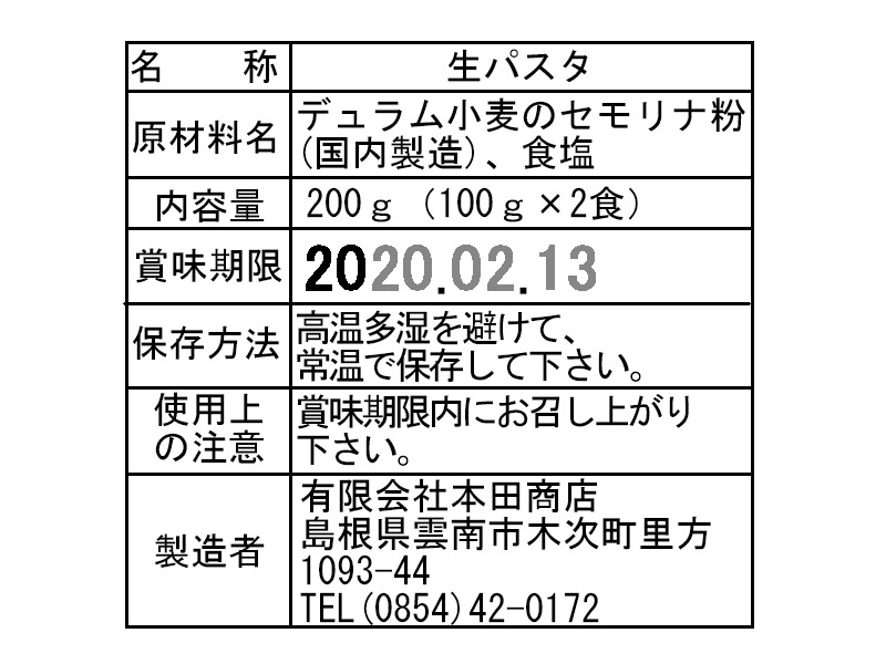 | 原材料 | デュラム小麦のセモリナ(国内製造)、食塩 |