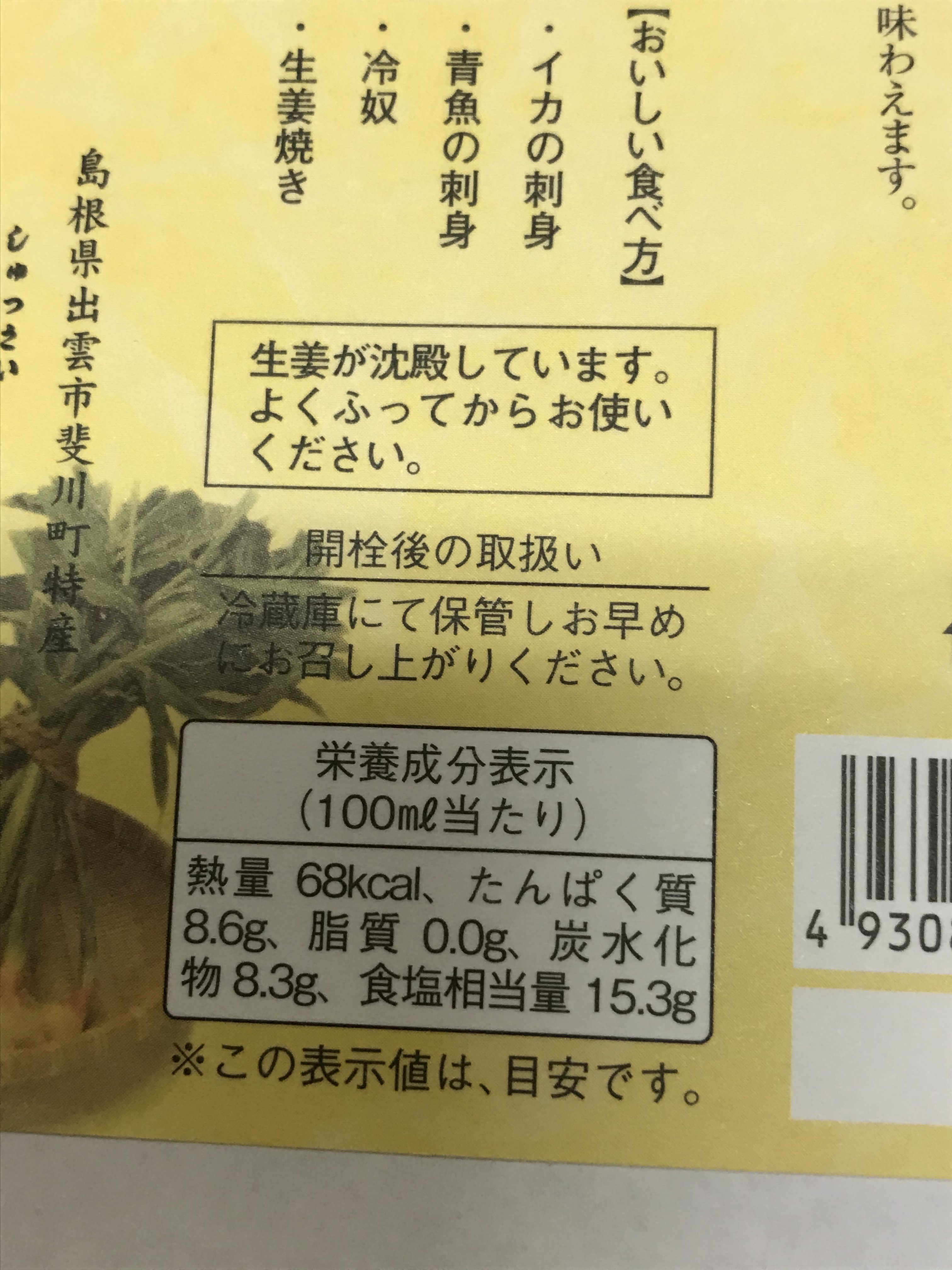 | 原材料 | 脱脂加工大豆(国内製造)、小麦、食塩、生姜 / 酒精 |