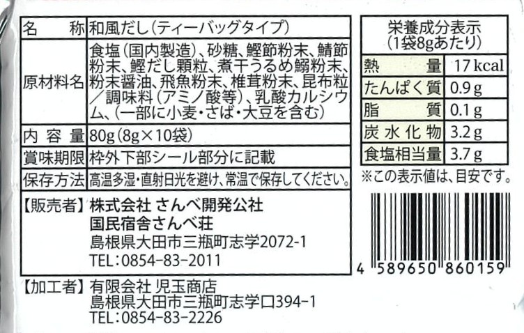 | 原材料 | 食塩(国内製造)、砂糖、鰹節粉末、鯖節粉末、鰹だし顆粒、煮干しうるめ鰯粉末、粉末醤油、飛魚粉末、椎茸粉末、昆布粉末/調味料(アミノ酸等)、乳酸カルシウム、(一部に小麦・さば・大豆を含む) |