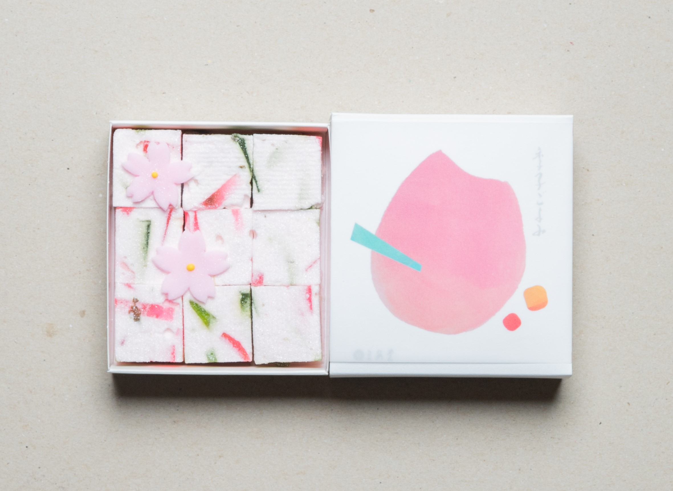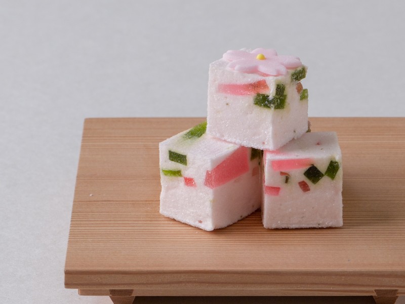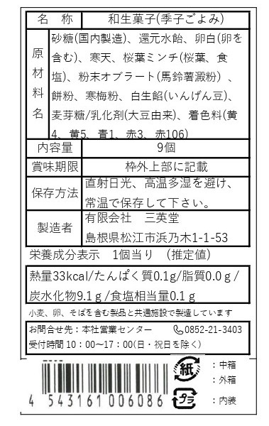 | 原材料 | 砂糖(国内製造)、還元水飴、卵白(卵を含む)、寒天、桜葉ミンチ(桜葉、食塩)、 粉末オブラート(馬鈴薯澱粉)、餅粉、寒梅粉、白生餡(いんげん豆)、麦芽糖/乳化剤(大豆由来)、着色料(黄4、黄5、青1、赤3、赤106) |