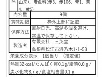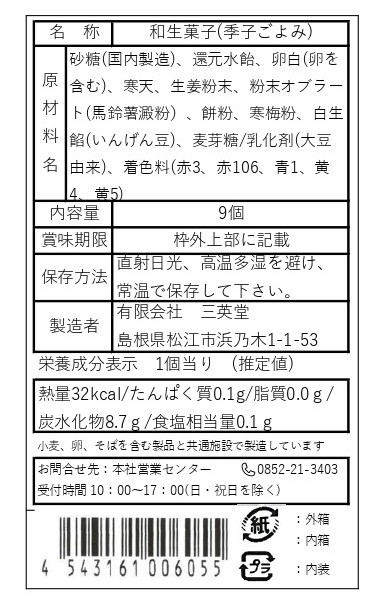 原材料 砂糖(国内製造)、還元水飴、卵白(卵を含む)、寒天、生姜粉末、粉末オブラート(馬鈴薯澱粉)、餅粉、寒梅粉、白生餡(いんげん豆)、麦芽糖/乳化剤(大豆由来)、着色料(赤3、赤106、青1、黄4、黄5)