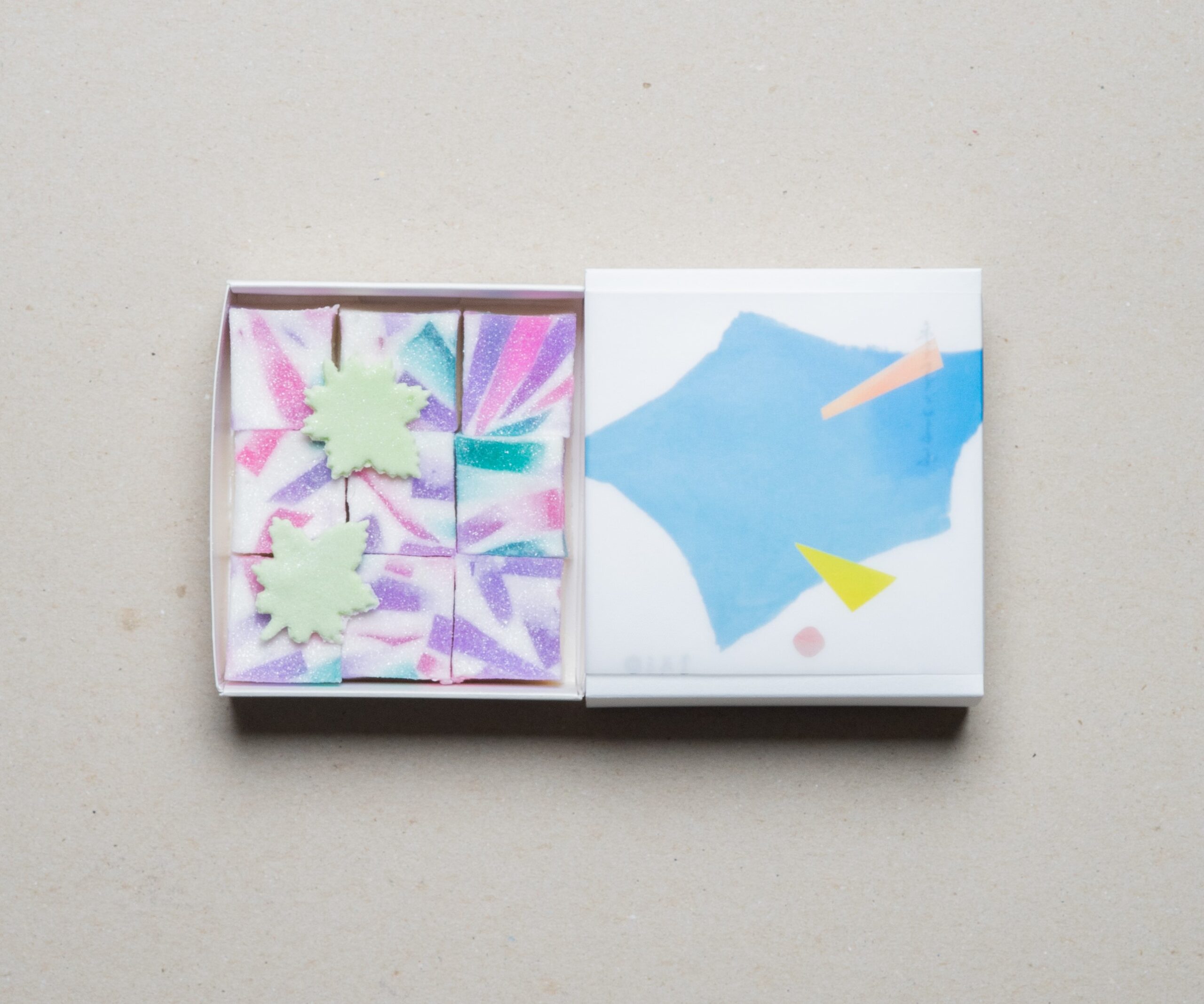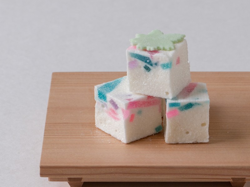 ふわふわとした食感の淡雪生地に3色の琥珀を散りばめ、出雲特産の出西(しゅっさい)生姜で風味を添えた味・見た目共に爽やかな夏の季節菓です。