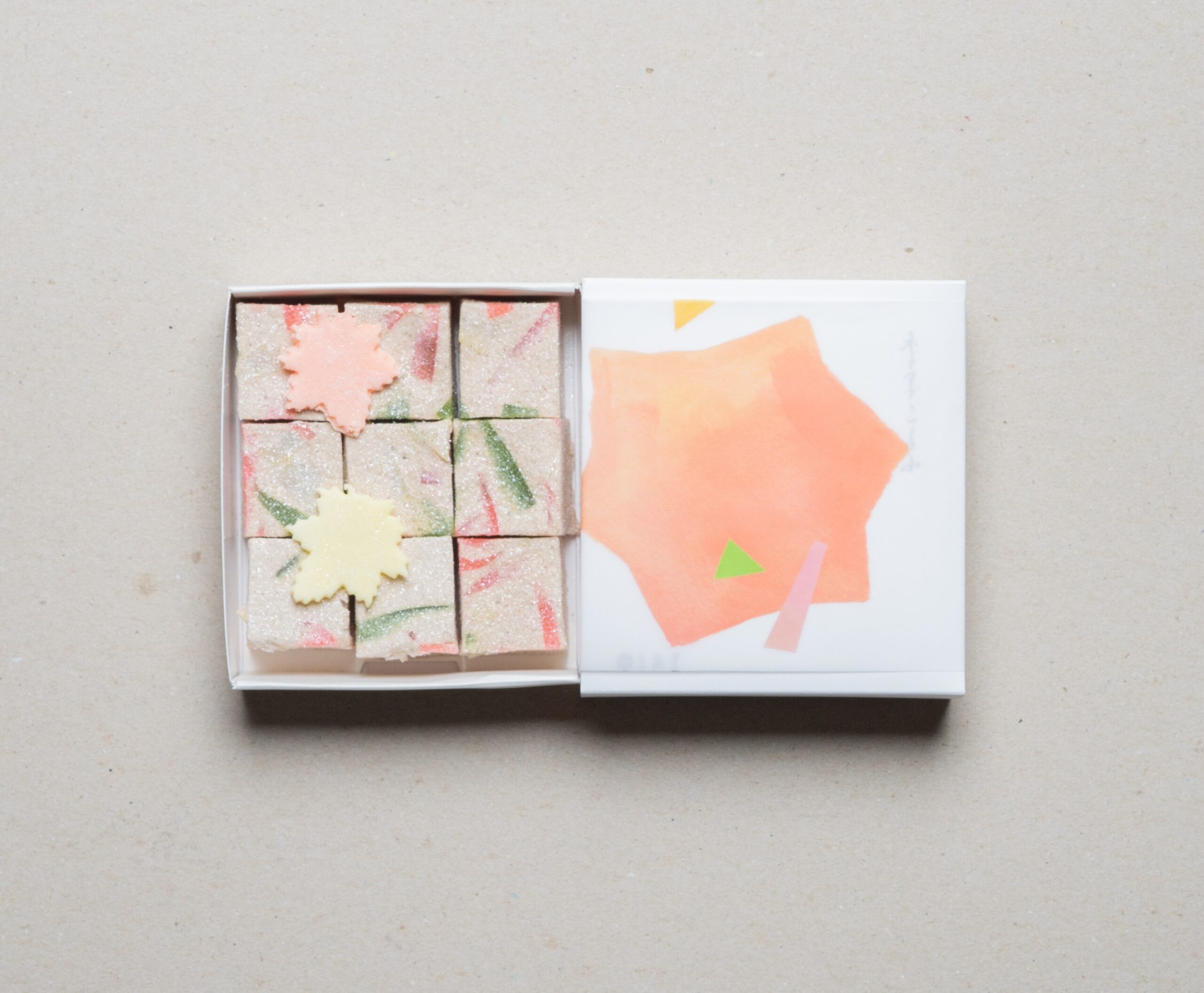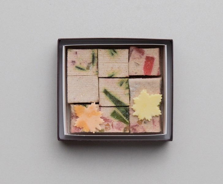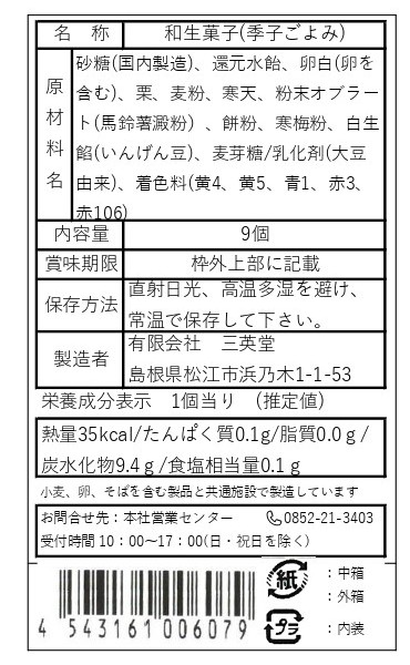| 原材料 | 砂糖(国内製造)、還元水飴、卵白(卵を含む)、栗、麦粉、寒天、粉末オブラート(馬鈴薯澱粉)、餅粉、寒梅粉、白生餡(いんげん豆)、麦芽糖/乳化剤(大豆由来)、着色料(黄4、黄5、青1、赤3、赤106) |