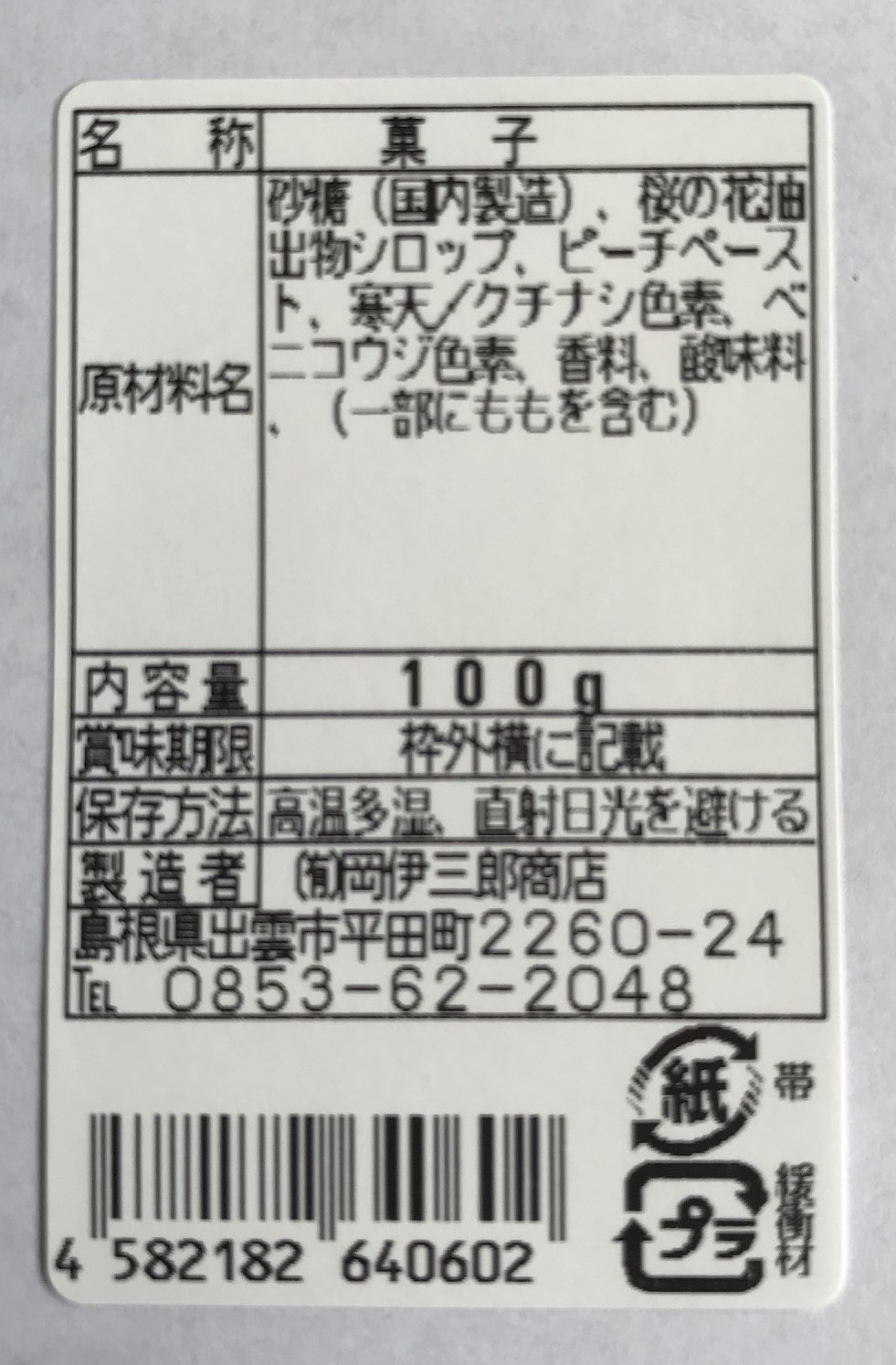 | 原材料 | 砂糖、桜ペースト、ピーチペースト、寒天、着色料(ラック)、酸味料 |
