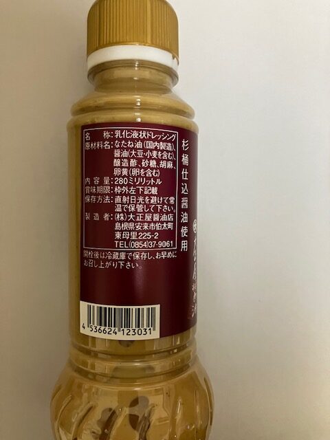 | 原材料 | なたね油(国内製造)、醬油(大豆・小麦を含む)、醸造酢、砂糖、胡麻、卵黄(卵を含む) |