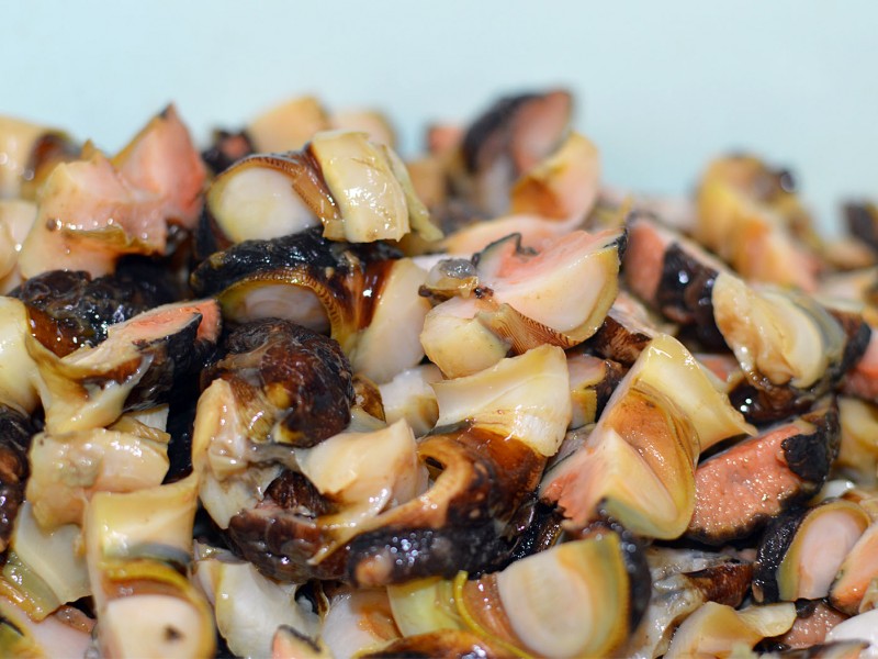 サザエ1㎏から約100gしか取れない可食部(お刺身で使用する部分)のみを唐辛子で漬け込みました。唐辛子の旨さとサザエの旨さが溶け合うように2日間熟成させたのち、小分けして冷凍保管します。熟成期間を置くことによって口当たりがまろやかになります