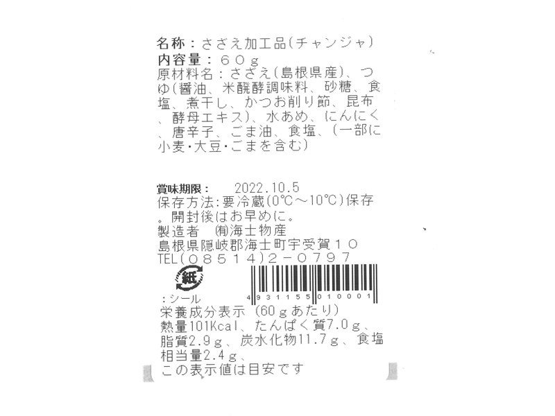 原材料 サザエ、つゆ(醤油、米発酵調味料、砂糖、食塩、煮干し、かつお削り節、昆布、酵母エキス)水あめ、にんにく、唐辛子、ごま油、食塩 (一部に小麦・大豆・ごまを含む)