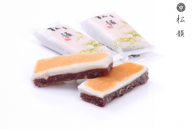 第26回全国菓子大博覧会において「名誉総裁賞」を受賞。島根県の県木「黒松」を主題に創作致しました。表面を軽く焼いた求肥に小倉餡と胡麻が乗った香ばしく、やさしい歯ざわりのお菓子です。個包装で、お召し上がりやすいサイズになっております。