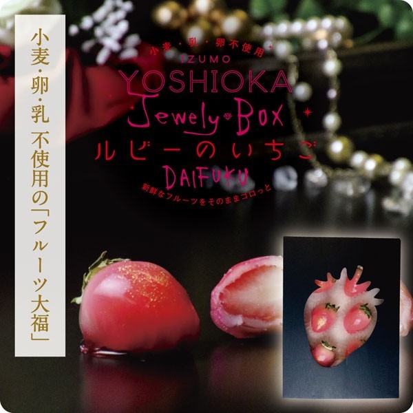 ①手づくりなのに、手を使わない。②最高を引き出す「国産いちご」のみ使用。③小麦、卵、乳を使用しない「和菓子」。④縁結びを願ったデザイン。⑤宝石をモチーフ。