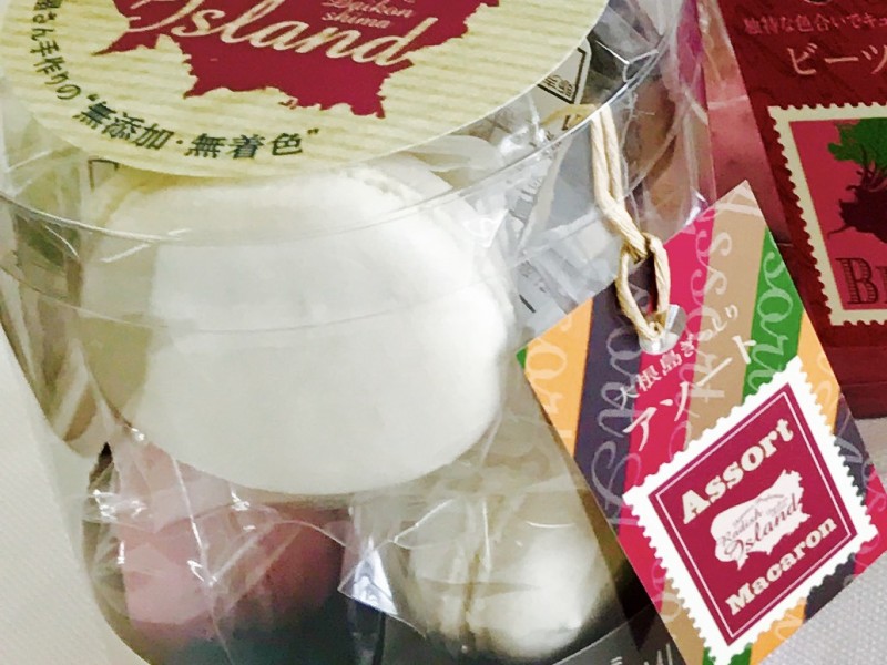 宍道湖産しじみパウダーをクリームに入れ込んだ黒いマカロンと、大根島で栽培された農産物を使用し、天然の色彩でかわいく仕上げました。