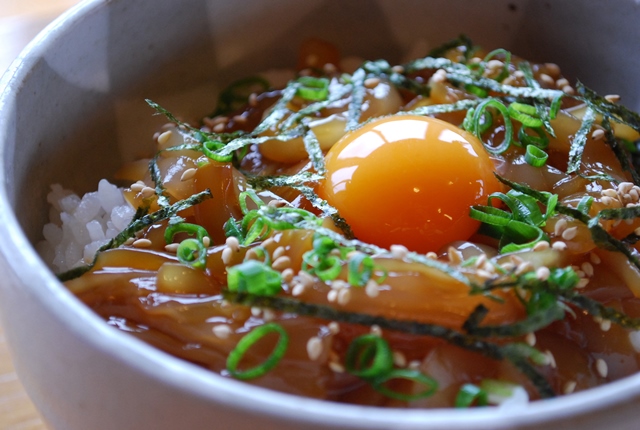 隠岐で冬に獲れるスルメイカは「寒シマメ」と呼ばれ、肉厚の身と脂の乗った肝が特徴です。この寒シマメの新鮮な上身を肝・醤油・酒で調合した特製肝醤油に漬け込みCAS凍結しました。解凍後ご飯にのせるだけで漬け丼としてお召し上がりください。