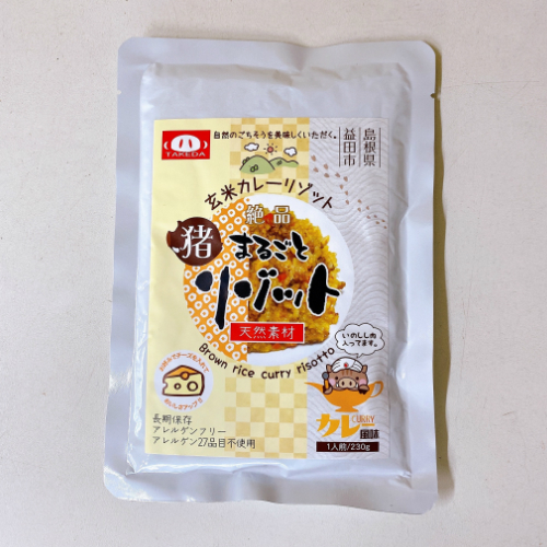 玄米カレーリゾットに天然の猪肉ミンチがたっぷり入っています。便利なレトルトです。