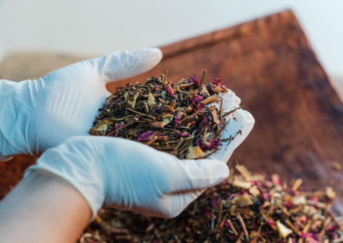 香味園では、食事によってワインをペアリングするように、合わせる食べ物や飲む時間、体への効能を考え、手作業でハーブや漢方とお茶をブレンドしています。